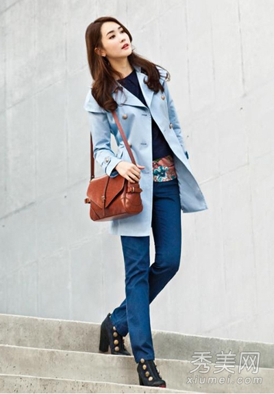 原色牛仔裤是最经典的色调,可以搭配浅蓝色风衣,深浅不一的色彩搭配相得映彰。李多海搭配藏蓝色打底衫,浅蓝色风衣,配上复古的单肩包,气质优雅女人味十足。