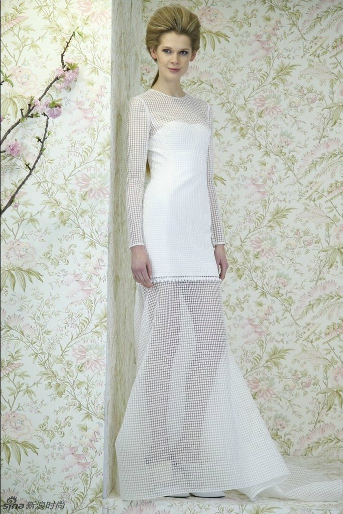 Angel Sanchez是本季唯一将具有廓形效果的网状纱质材料应用于婚纱礼服的品牌。廓型效果极佳的透视裙摆,让性感美腿带上了一层神秘的梦幻色彩,同时,网状裙摆还能巧妙的修饰腿部线条,弥补你腿部曲线的小瑕疵。