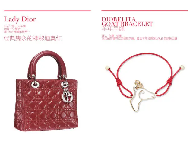 鲜红的色彩中跳动出新年的欢欣,经典隽永的Lady Dior以一款红色小羊皮特别款增添新年的气氛。别忘了,还有限量款羊年手绳,以黄金材质搭配中国传统红绳,给新年带来好彩头。